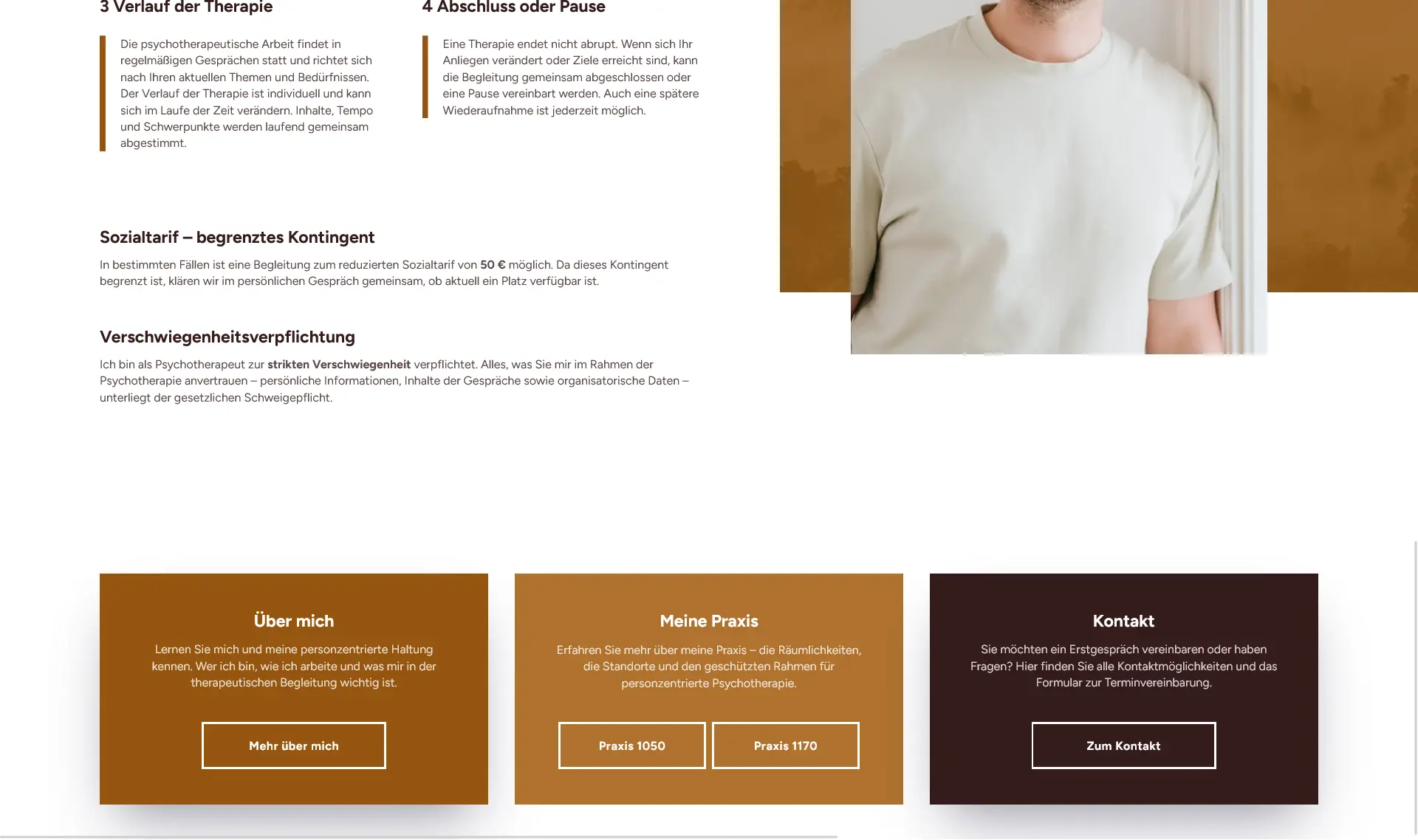 Design-technisch habe ich mich an den bestehenden, erdigen Farben orientiert, aber das Ganze moderner umgesetzt. Das Orange/Ocker aus der Praxiseinrichtung wurde bewusst als Highlightfarbe eingesetzt, damit die Seite lebendiger wirkt, aber trotzdem authentisch bleibt.